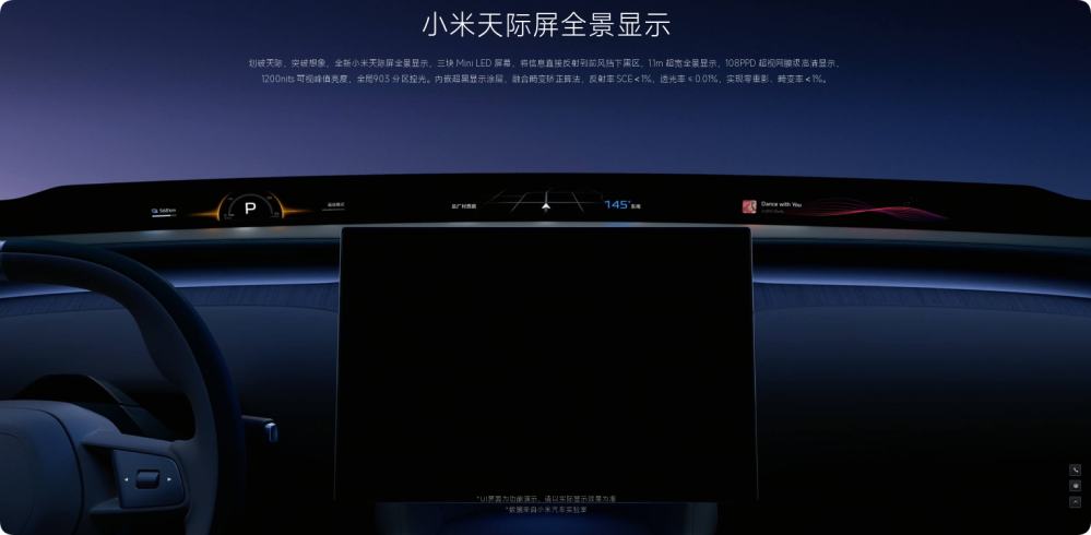 车载投影有个致命问题:前挡风玻璃是曲面的,直接投影会导致图像扭曲。小米的解决方案堪称“像素级雕刻”——在挡风玻璃下方藏了三块MiniLED屏幕,每一块都对应不同的视角区域。通过算法实时计算光线折射路径,最终在玻璃上合成出平整的画面。官方数据显示,这套系统的108PPD像素密度已经接近人眼视网膜极限,文字边缘锐利到几乎能切开空气。